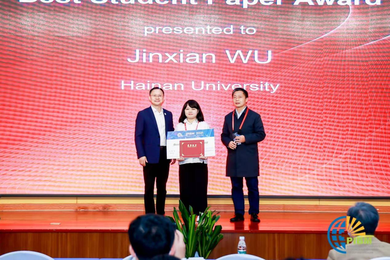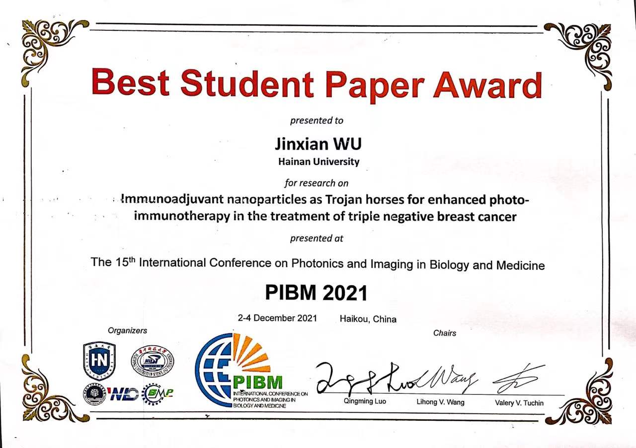此次大会中,总共70余名学生做报告,最终8名学生荣获优秀学生论文。我院硕士研究生吴瑾娴(导师:周非凡)获此殊荣,大会共同主席海南大学校长骆清铭院士为其颁发证书。她以“Immunoadjuvant nanoparticles as Trojan horses for enhanced photo-immunotherapy in the treatment of triple negative breast cancer”为题目做了口头报告。