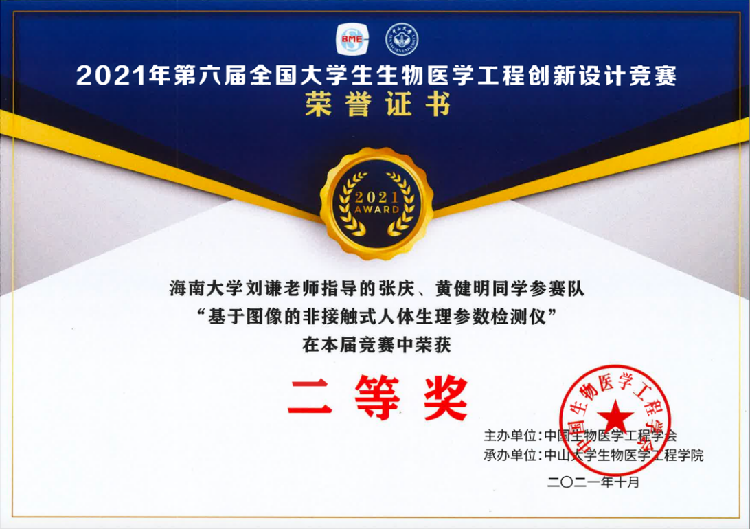 2021年10月31日,第六届全国大学生生物医学工程创新设计竞赛决赛在中山大学以线上方式举行。在此次竞赛中我院参赛作品《靶向给药细菌微机器人的构建及其肿瘤诊疗一体化研究》(指导教师:吴锡龙,参赛学生:吕超逸、陈贺、叶大平)、《基于图像的非接触式人体生理参数检测仪》(指导教师:刘谦,参赛学生:张庆、黄健明)分获全国一等奖和二等奖各1项。此外,作品《基于智能眼镜的健康参数监测系统》获三等奖。