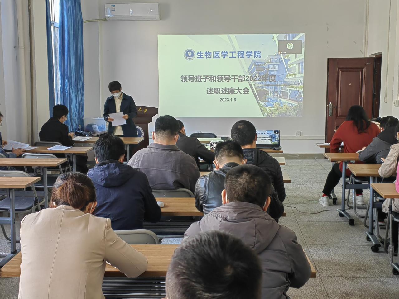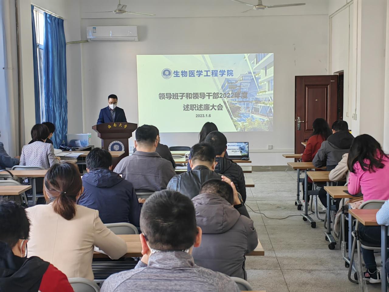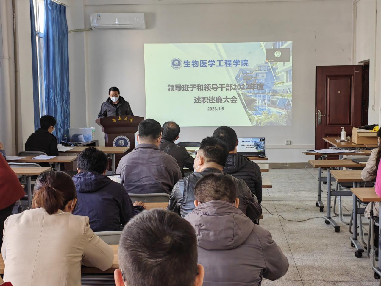 之后,刘谦院长代表领导班子做2022年度学院工作总结报告,向大会报告领导班子党风廉政建设责任、学院的建设和发展工作中的亮点、不足与改进等。并做个人述职述廉报告。