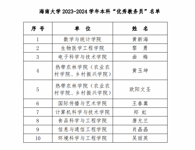 近日,在学校教务处发布《海南大学2023-2024学年本科“优秀教务员”评选结果公示》中,我院教研办黎勇老师凭借其出色的工作表现和卓越的教学管理能力,荣获“优秀教务员”称号。