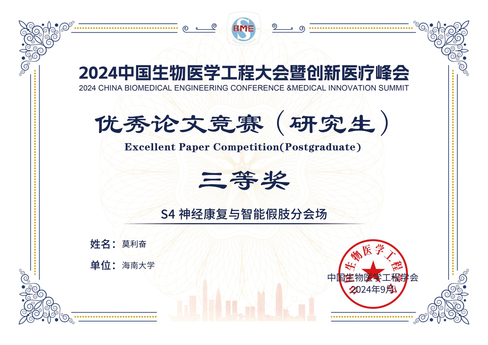 9月20日至22日,2024中国生物医学工程大会暨创新医疗峰会(BME2024)在深圳国际会展中心举行。大会以“医工融合发展 创新引领未来”为主题,院士、专家与青年才俊齐聚一堂,共话生物医学工程发展新篇章。中国生物医学工程学会第十一届理事会候任理事长、海南大学校长、中国科学院院士骆清铭出席大会。我院师生在李鹏程院长的带领下注册参会。