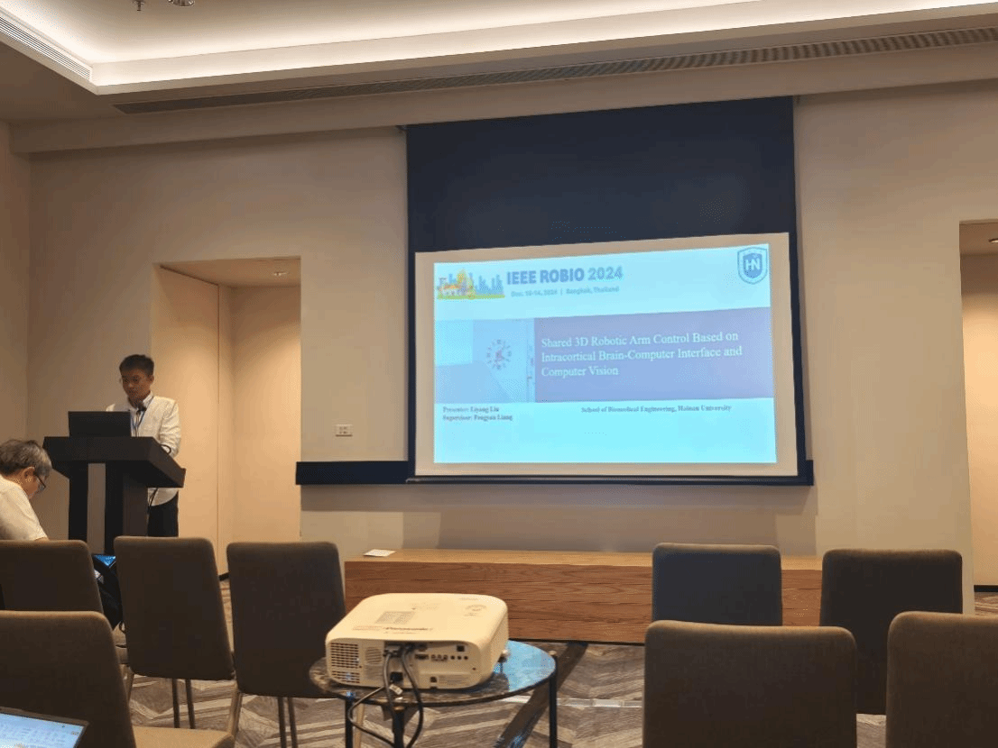 研究生刘立扬在Neurorobotics分会场进行了题目为《Shared 3D Robotic Arm Control Based on Intracortical Brain-Computer Interface and Computer Vision》的报告。