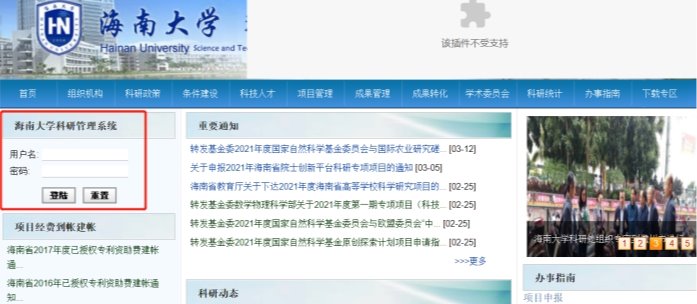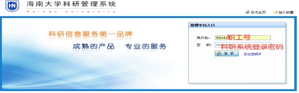 登录学校科技处网站(https://ha.hainanu.edu.cn/keji/)→ 左上角“海南大学科研管理系统”→ 输入职工号与密码 → 进入“科研空间”录入项目、经费、成果、论文、专利等。