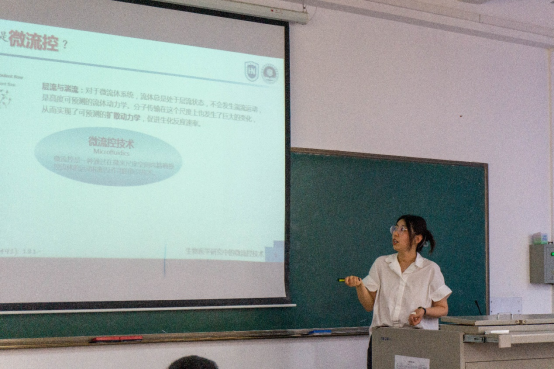 史冰老师的主要研究方向主要分为两个:微流控液滴分析和微流控系统在生物分析、临床检验及现场分析中的应用。史冰老师从解词的角度切入,将微流控的英文单词拆开,直观通俗地向大家讲解了“什么是微流控”。同时,为帮助同学对微流控技术的理解,史冰老师也为大家讲解了与微流控技术息息相关的概念,通过动画和实例进一步加强大家对微流控技术的认识。随后,史冰老师进一步为大家展示了微流控的组成,起源和发展历程,并着重讲解了微流控技术在生物医学工程领域中的相关应用,如数字PCR技术、流动共聚焦的发展、器官芯片的出现以及与深度学习结合的一些实际应用。