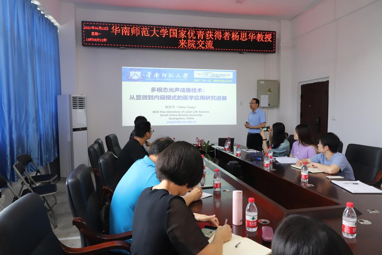 2021年4月12日下午,华南师范大学激光生命科学教育部重点实验室主任杨思华教授应邀分享多模态光声成像技术——从显微到内窥模式的医学应用研究。william威廉亚洲官方周非凡、黄振立、卓俊杰、田朝阳老师,部分博士生、研究生和本科生参加讲座。讲座由张云竹书记主持。