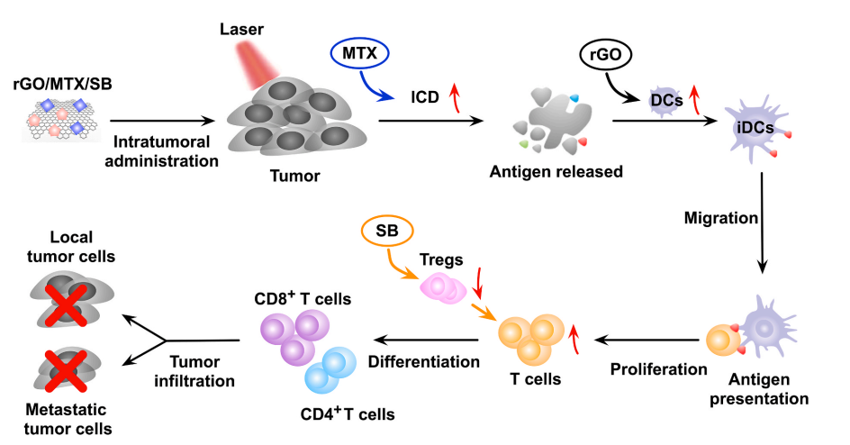 该论文研究构建了一种rGO/MTX/SB纳米系统,联合激光照射诱导了协同的化学-免疫-光热抗肿瘤效应在免疫原性较差、转移能力较高的4T1小鼠乳腺肿瘤模型中,可破坏局部原发肿瘤,并抑制远处转移。经过治疗后,70%荷瘤小鼠长期存活,并产生了肿瘤类型特异性免疫,以抵抗再激发的肿瘤细胞。这种独具潜力的治疗组合有望作为一种用于转移性癌症的有前景方法