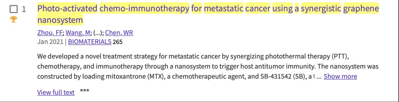 根据美国基本科学指标(Essential Science Indicator, ESI20215月公布的数据显示,以海南大学为第一单位,周非凡教授为第一作者及通讯作者, 20211月发表的学术论文“Photo-activated chemo-immunotherapy for metastatic cancer using a synergistic graphene nanosystem”成功入选全球前1% ESI高被引论文。该论文在国际顶级(Top)期刊《Biomaterials》(IF=12.479,中科院分区工程技术1区)发表。