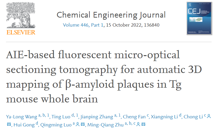 近期,海南大学朱明强团队&骆清铭团队合作报道了一类AIE活性的水溶性Aβ探针,该类型探针比商用探针ThT对Aβ纤维具有更强的亲和力,表现出更出色的Aβ靶向性和特异性,并且可在小鼠脑组织内实现Aβ斑块的快速免漂洗标记。使用此原位标记探针结合荧光显微光学切片断层成像系统(fMOST),通过原位标记/成像/逐层切削的循环过程,实现了Tg小鼠全脑Aβ斑块的自动3D成像。此项研究成果以“AIE-based fluorescent micro-optical sectioning tomography for automatic 3D mapping of β-amyloid plaques in Tg mouse whole brain”为题发表在《Chemical Engineering Journal》(IF=16.744)上。