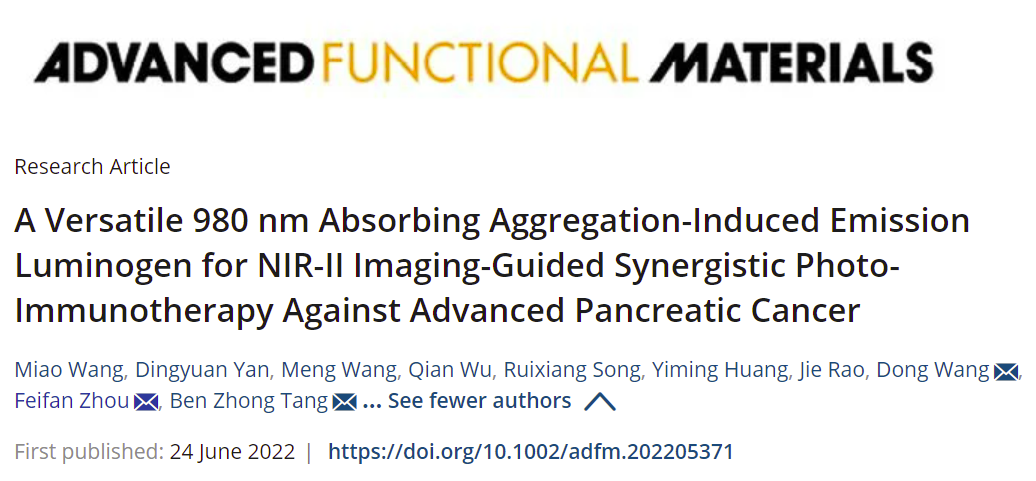胰腺癌被称为癌中之王,其5年生存率仅为10%左右,如何有效治疗胰腺癌是生物医学和临床领域所面临的最具挑战性的问题。近日,海南大学周非凡教授和深圳大学唐本忠院士、王东教授合作开发了一种新的胰腺癌治疗策略,利用具有聚集诱导发射倾向的980 nm吸收剂,实现了胰腺原位深层成像和光热-免疫联合治疗,有效靶向杀伤原位肿瘤并诱导免疫效应抑制肿瘤转移。相关研究成果以“A Versatile 980 nm Absorbing Aggregation-Induced Emission Luminogen for NIR-II Imaging-Guided Synergistic Photo-Immunotherapy Against Advanced Pancreatic Cancer”为题发表在《Advanced Functional Materials》(IF=19.924)。