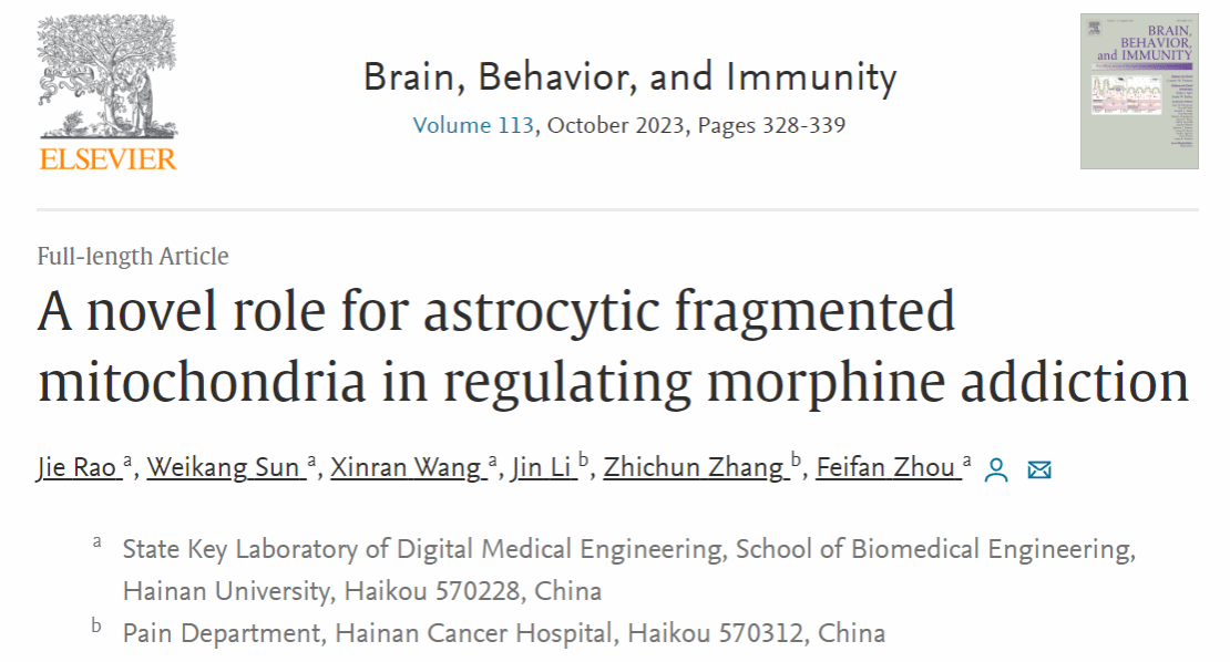 2023年8月6日, 海南大学周非凡教授团队的最新研究成果“A novel role for astrocytic fragmented mitochondria in regulating morphine addiction”发表于权威杂志《Brain, Behavior, and Immunity》(中科院大类1区Top期刊,IF=15.1)。研究团队阐明了星形胶质细胞在吗啡诱导的神经炎症及成瘾中的重要性及调控机制,为成瘾机制研究提供了新的方向,并为成瘾治疗提供了潜在途径。