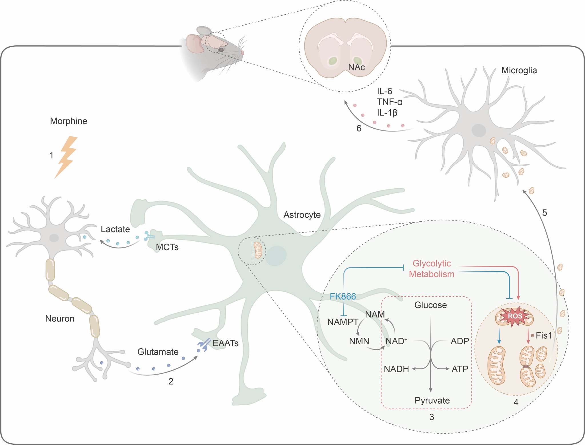 吗啡会导致伏隔核脑区产生神经适应性变化,诱发神经炎症并导致成瘾行为,给人类健康与社会发展带来了极大的负担,然而其作用机制尚未清楚。该研究表明,星形胶质细胞在吗啡诱导的神经炎症中起着关键的调节作用。具体来说,神经炎症失调是由于星形胶质细胞中的糖酵解代谢激增而引起的,异常的糖酵解代谢导致星形胶质细胞中的线粒体生理功能异常并过度破碎,而破碎的线粒体释放到细胞外环境中,随后通过激活小胶质细胞引发剧烈的炎症反应。通过使用FK866阻断烟酰胺腺嘌呤二核苷酸的回救途径抑制星形胶质细胞的糖酵解代谢,可以有效地减弱吗啡诱导的神经炎症和成瘾行为。