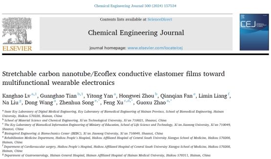 近日,我院柔性电子材料与器件团队在国际高水平SCI期刊《Chemical Engineering Journal》(中科院一区TOP,IF=13.3)发表题为“Stretchable carbon nanotube/Ecoflex conductive elastomer films toward multifunctional wearable electronics”的研究论文。
