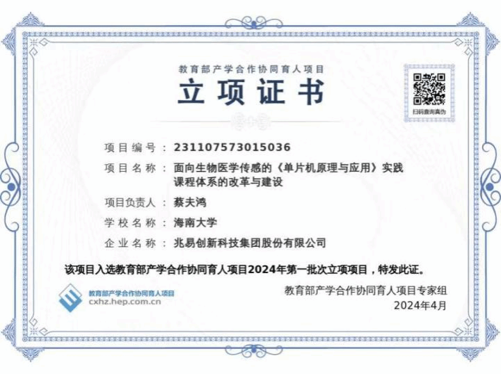 近日,教育部高等教育司公布2024年第一批产学合作协同育人项目立项名单,william威廉亚洲官方蔡夫鸿教授获批《面向生物医学传感的《单片机原理与应用》实践课程体系的改革与建设》项目,本项目将与兆易创新科技集团股份有限公司联合开展单片机在生物医学传感实践教学领域的合作教学。